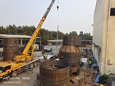 本超低排放系统工程施工工序复杂,涉及土建、拆除、平移、机电、防腐、电仪等多工种施工,含脱硫、脱硝、锅炉改造等多系统工程。工期短,工程量大,任务重。我公司承建后,立即成立项目经理部并组织施工人员进场,立即采购材料到场,以最快速度做好开工前准备工作,并于2021年3月1日顺利开工建设。现正在同步进行脱硫塔预制拼装、塔体平台预制拼装、反应器预制拼装,脱硫烟道预制等多项非标件制作。同时土建正在进行工艺楼二楼楼板浇筑、脱硫塔基础完成;原水膜除尘塔拆除也正在进行。所有施工工作有条不紊的顺利展开。